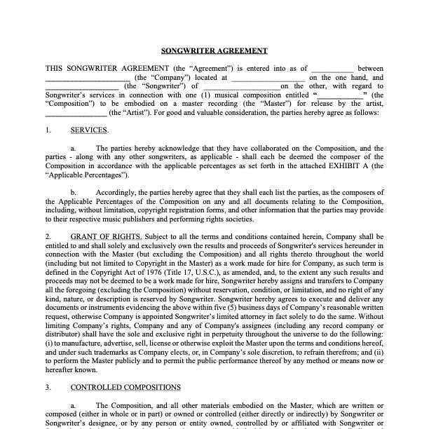 This comprehensive 3-page songwriter agreement is specifically designed for situations where a company such as a record label, publishing company, or artist’s business entity hires a songwriter solely for songwriting purposes. The template ensures clarity by defining the songwriter’s entitlement to a share of the publishing rights while excluding participation in the master recording rights.